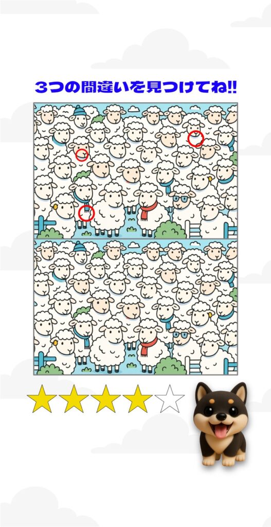 画面いっぱいに広がる羊たちの中に、全部で 5つの間違い が隠されています。