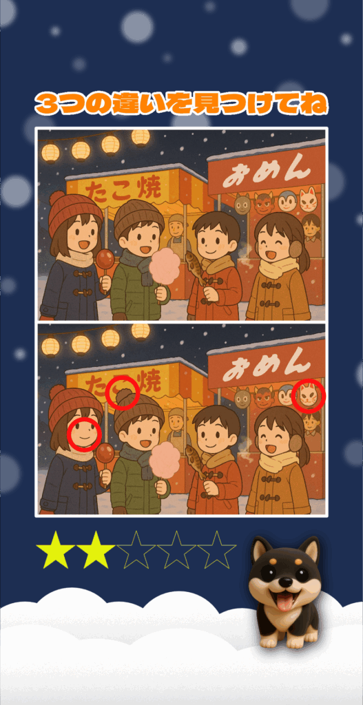 今回の「冬のお祭りのイラスト」間違い探し、中級編はいかがでしたか?