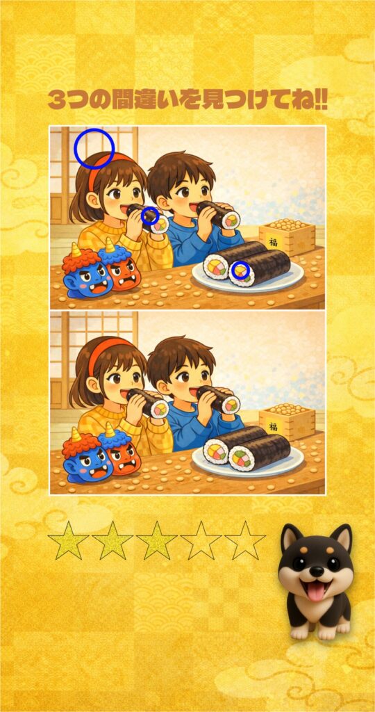 今回の「節分の恵方巻きシーン」間違い探し、中級編はいかがでしたか?